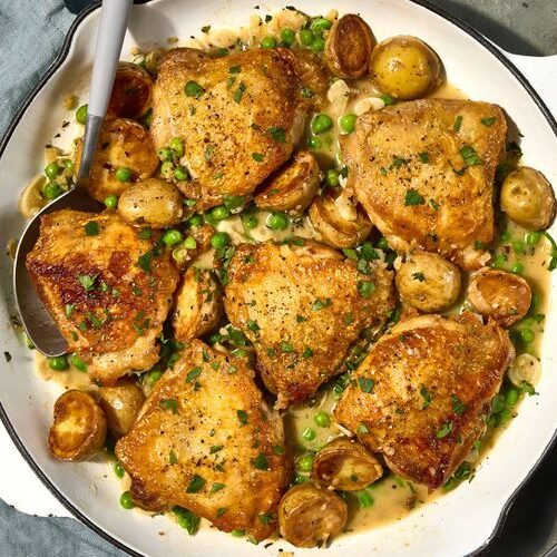 Chicken Vesuvio consists of crispy chicken, white wine, and potatoes braised in a garlic-wine sauce with lemon. The brightness of the wine and lemon balance the richness of the chicken thighs. The peas offer a subtle sweetness and a little pop of texture, while the blend of the herbs keeps this stew-like dish bright.